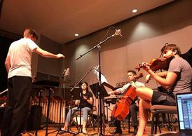 The UCF New Music Ensemble, directed by Dr. Thad Anderson, records Top of the World for pierrot ensemble.